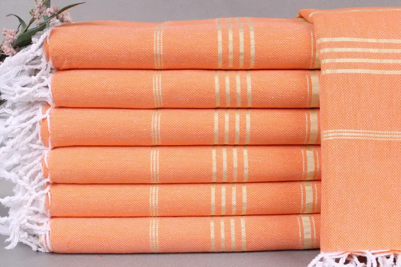 Turkish cotton towels ensure superior absorbency and durability. Characterized by a weight of 265 grams, these towels are hand-woven on looms resulting in precise dimensions of 71x40 inches or 180x100 centimeters. Weaving tolerances can vary by ± 2 inches or 5 centimeters.