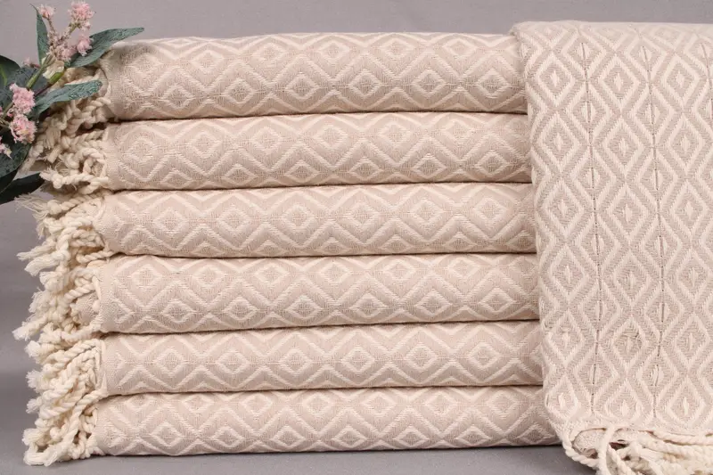 Comprising organic Turkish cotton fibers, these towels are characterized by their high absorbency and durability. Ensuring softness through multiple washes, the towels are handwoven with precision, resulting in a slight tolerance of ±2 inches or ±5 centimeters. Each piece weighs 440 grams and measures 40x71 inches or 100x180 centimeters.