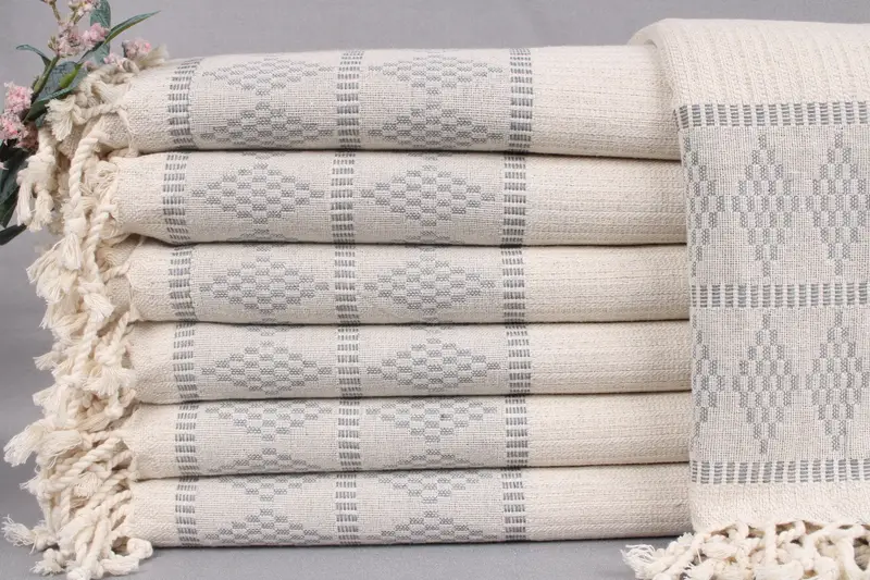 Absorbency is ensured through the use of organic Turkish cotton, which is employed in the weaving of these beach towels. Each towel is handcrafted with attention to detail, resulting in dimensions of 36x71 inches or 90x180 centimeters. Considering a ± 2" or 5 cm tolerance, the towels weigh approximately 480 grams.