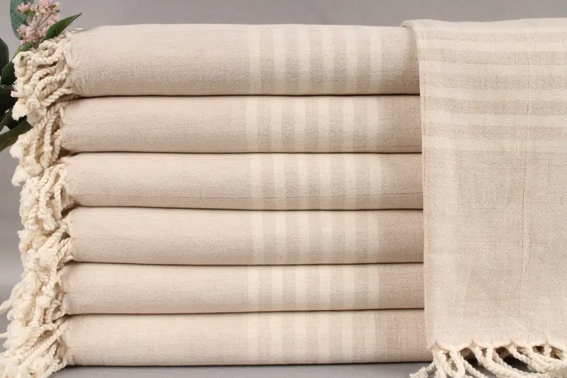 The Turkish towels are composed of 100% organic cotton, ensuring superior absorbency and softness. Characterized by their dimensions of 40x71 inches or 100x180 centimeters and a weight of 300 grams, these towels are meticulously handcrafted with a tolerance of ±2 inches or 5 centimeters due to the weaving process. Customization through embroidery, including letters, names, or logos, is available at no additional cost, with recommended placements at the middle of the bottom.