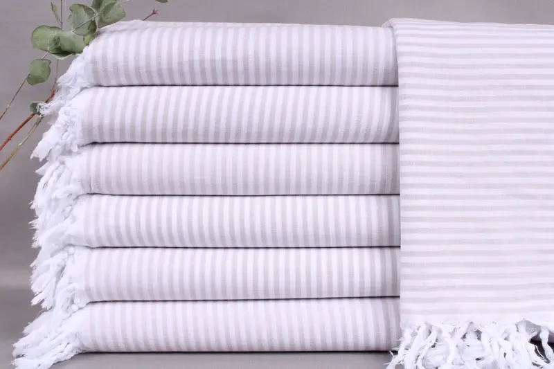 These Turkish towels, categorized under beach towels, are woven from organic Turkish cotton, ensuring superior absorbency and comfort. Each towel measures 40x63 inches or 100x160 centimeters, weighing approximately 200 grams, with a weaving tolerance of ± 2" or 5 cm. Resulting in a handcrafted product, each towel can be personalized with embroidery or a name.