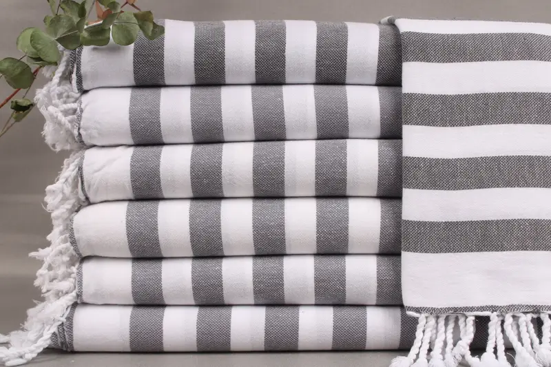 Fiber composition for the towels comprises organic Turkish cotton, ensuring durability and soft texture. Each piece is hand-woven on looms, resulting in a unique handmade finish. Dimensions are precisely 38x65 inches or 95x165 centimeters with a tolerance of ± 2 inches or 5 centimeters, and the weight is 300 grams.