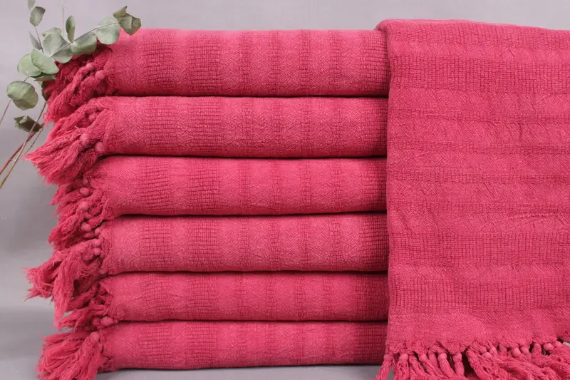 Our beach towels, small towels, and throws are woven from organic Turkish cotton, ensuring durability and soft texture. Resulting in a weight of 300 grams, the towels measure 36x67 inches or 90x170 centimeters, with a ±2" or 5cm tolerance due to hand-weaving. Customization options include embroidery or personal lettering, with a recommendation to place designs in the middle of the towel.