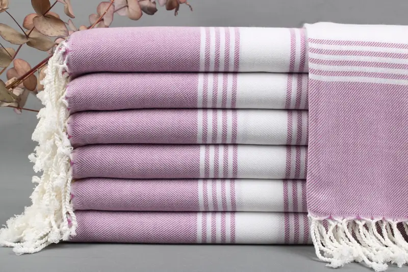 Organic Turkish cotton ensures enhanced absorbency and softness. Each beach towel, measuring 40x70 inches or 100x180 cm, weighs between 425-475 grams. The towels are woven by hand with a tolerance of ±2 inches (5 cm).