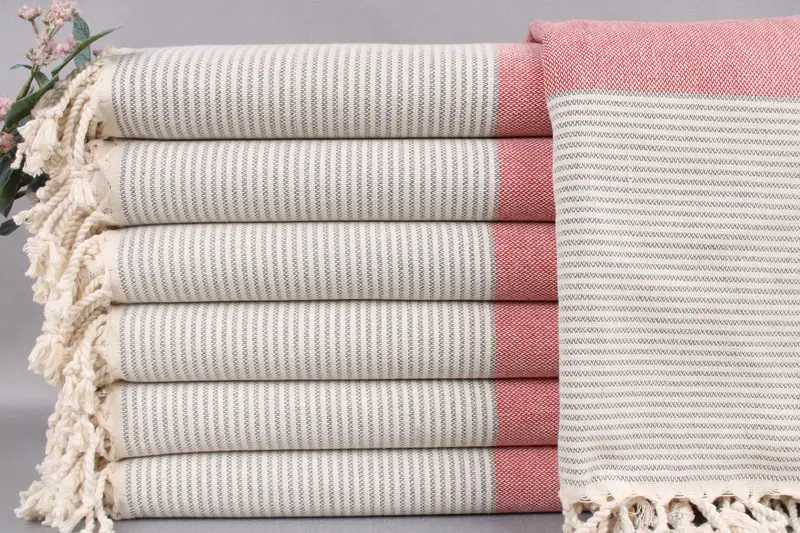 Organic Turkish cotton forms the basis of these beach towels, ensuring high absorbency and softness. Resulting in towels measuring 71x40 inches or 180x100 centimeters, each weighing approximately 350 grams. Tolerances in size due to hand-weaving techniques are within ± 2" or 5 centimeters.