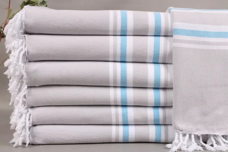 Organic Turkish cotton characterizes these beach towels, ensuring high quality and exceptional absorbency. Resulting in an average size of 40x71 inches or 100x180 centimeters, they weigh approximately 304 grams. Each piece exhibits a ± 2-inch or 5 cm tolerance due to its hand-weaving nature.