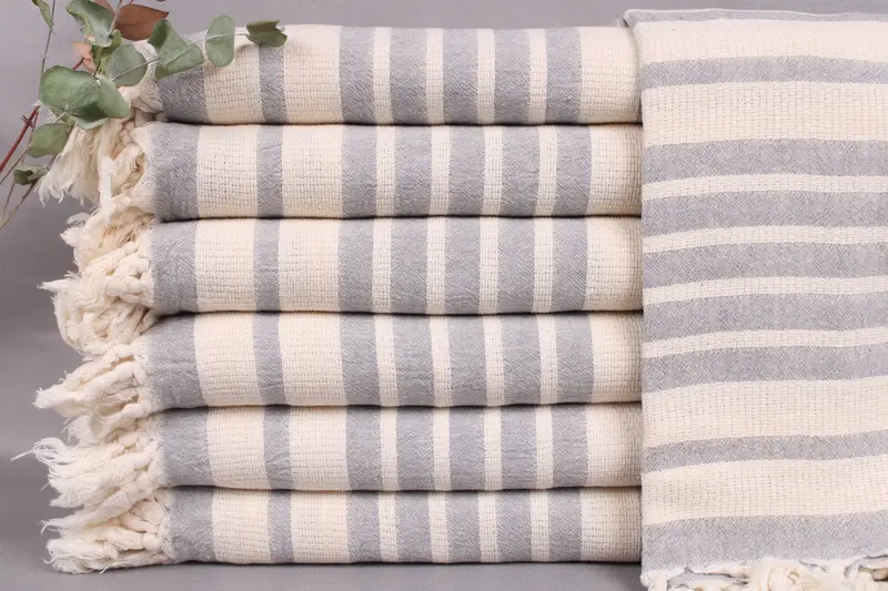 Weaved from organic Turkish cotton, these towels are characterized by their high absorbency and durability, ensuring long-term use. Each towel measures 34x71 inches or 85x180 centimeters, weighing approximately 320 grams. Hand-weaving tolerances may result in variations up to ± 2" or 5 centimeters.