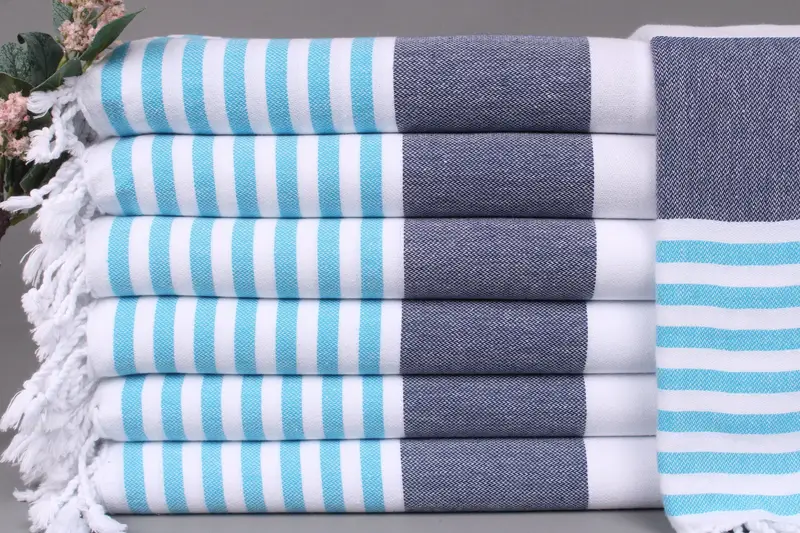 The Turkish beach towels are woven from organic Turkish cotton, ensuring superior absorbency and a lightweight feel. Each towel measures 40x71 inches or 100x180 centimeters, weighing approximately 290 grams, with a weaving tolerance of ±2 inches or 5 centimeters. Embroidery customization options are available, allowing personalization with letters, names, or logos, resulting in a unique, pre-shrunk product.