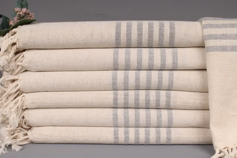 Organic Turkish cotton ensures high-quality absorbency and softness, characterized by hand-weaving on traditional looms. Resulting in towels that weigh 250 grams and measure 36x67 inches or 90x170 centimeters with a tolerance of ±2 inches or 5 centimeters. Embroidery customization is available for personalization with letters, names, or logos, ensuring a pre-shrunk status for each piece.