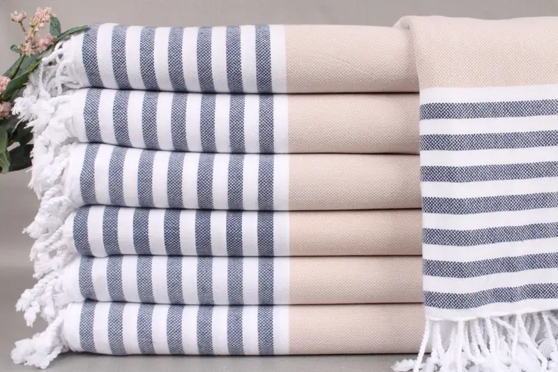 Turkish towels are woven from organic Turkish cotton, characterized by exceptional absorbency and softness. Resulting in a weight of 280 grams, these towels ensure superior quality. Each piece measures 40x71 inches or 100x180 centimeters, with a tolerance of ± 2 inches or 5 centimeters.