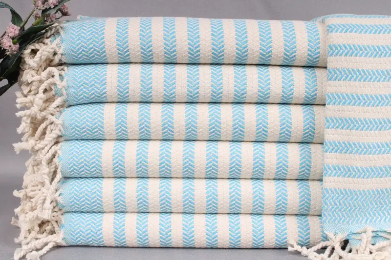 Each beach towel, woven from organic Turkish cotton, conforms to specified dimensions and weight. The precision in hand-weaving results in minor deviations of up to 5 centimeters. The towel's construction ensures durabilit...