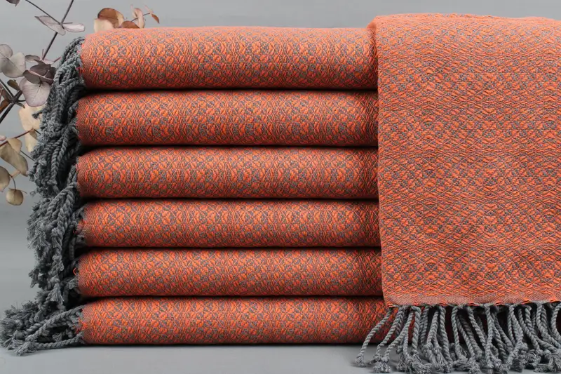 Turkish beach towels are crafted from organic Turkish cotton, characterized by their natural softness and durability. The towels, weighing between 425-475 grams, are woven by hand on looms, ensuring a high-quality finish and intricate patterns. Each towel features a secondary color of beige, adding a refined touch to their appearance.