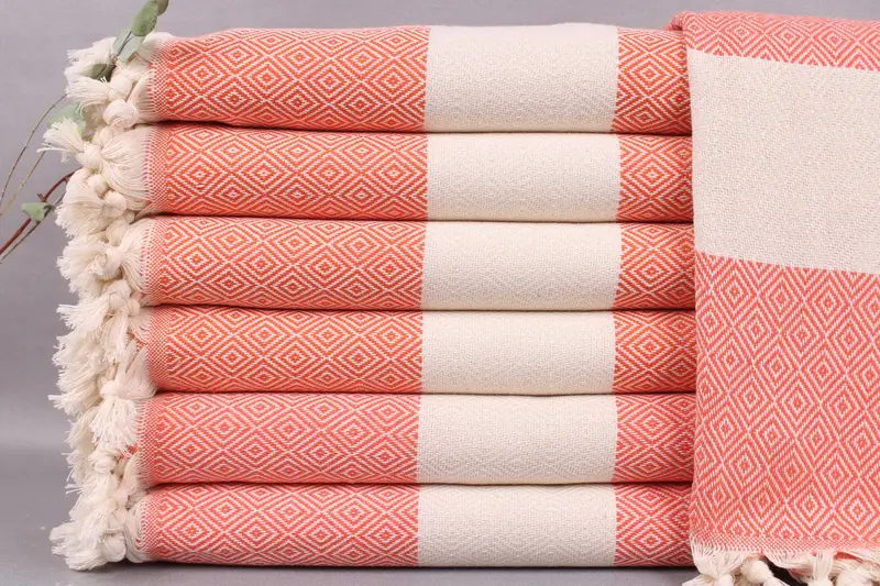 The Turkish beach towels are woven from organic Turkish cotton, ensuring durability and high absorbency. Resulting in a towel that measures 40x71 inches or 100x180 centimeters with a tolerance of ±2 inches (5 centimeters) due to the hand-weaving process. Weighing approximately 420 grams, these towels are crafted meticulously, providing both sturdiness and comfort.
