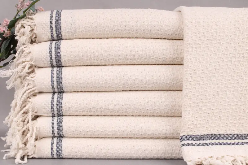 Ensuring durability and comfort, the personalized beach towel is woven from organic Turkish cotton, enhancing absorbency and softness. Measuring 67x36 inches or 170x90 centimeters, this towel weighs 440 grams, with a tolerance of ± 2 inches or 5 centimeters due to hand-weaving. Resulting in a pre-shrunk status, each towel offers customization options for personalization with embroidery or text placements.