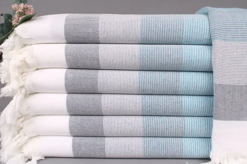 Each beach towel is woven from organic Turkish cotton, ensuring premium quality and superior absorbency. Resulting in a durable, hand-woven product that provides optimal utility for various applications. Characterized by its 40x67 inches (100x170 cm) dimensions and 260 grams weight, these towels can exhibit a ± 2" (5 cm) variance due to the weaving process. Customization options include personal monograms, names, or logos embroidered in specified font and color, placed at the middle of the bottom for enhanced visibility.