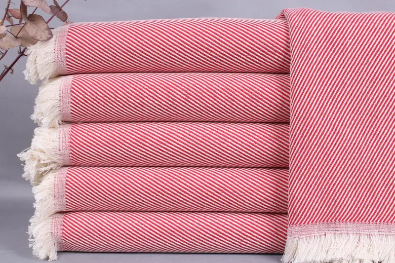 The Turkish Towels are woven from organic Turkish cotton, ensuring high quality and durability. Resulting in a fiber composition characterized by natural absorbency, these towels measure 36x71 inches or 90x180 centimeters, with a weight of 420 grams. The hand-weaving process results in a tolerance of ±2 inches or 5 centimeters.