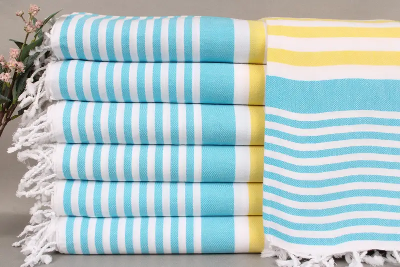 All Turkish towels are woven from organic Turkish cotton, ensuring superior absorbency and durability. Resulting in a product characterized by lightweight at 260 grams while maintaining dimensions of 36x67 inches (90x170 centimeters). Tolerance in weaving may result in size variations of ± 2 inches (± 5 centimeters).