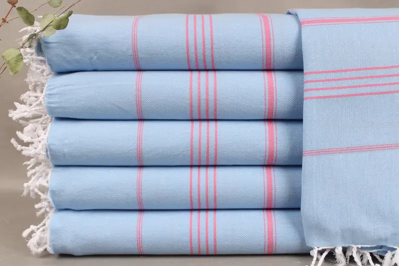 The towel, woven from organic Turkish cotton, exhibits high absorbency, ensuring efficient moisture management. Measuring 40x71 inches or 100x180 centimeters, it weighs 265 grams. Weaving tolerances can result in size variations of ± 2 inches or 5 centimeters.