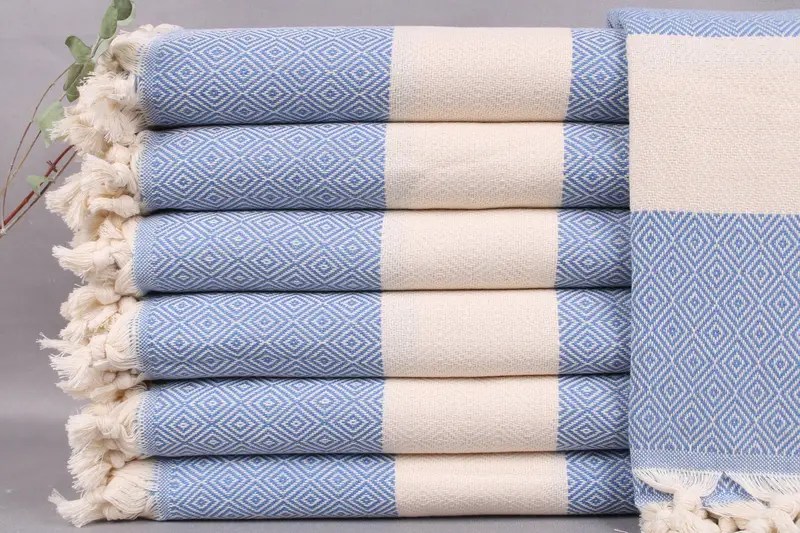 Each towel is woven from organic Turkish cotton, ensuring softness and absorbency after washing. Characterized by precise hand-weaving, the towels measure 40x71 inches (100x180 cm) with a tolerance of ±2" (5 cm). Weighing 420 grams, these towels are pre-shrunk.