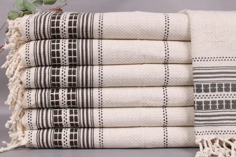 Woven exclusively from organic Turkish cotton, these towels are characterized by their exceptional absorbency and durability. Ensuring a 20x40 inches or 50x100 centimeters dimension, each towel weighs 120 grams, maintaining a ±2 inches or 5 centimeters tolerance due to hand-weaving processes. Precision in personalization is offered, allowing for embroidery with letters, names, or logos, complemented by specified font, color, and placement preferences.