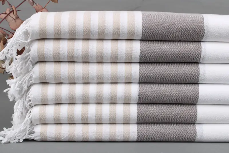 All items are woven from organic Turkish cotton, ensuring high absorbency and softness. The towels are sized at 40x70 inches or 100x180 centimeters, weighing between 425 and 475 grams, with a weaving tolerance of ±2 inches or 5 centimeters. Each product is handcrafted, allowing for precise placement of embroidery or text.