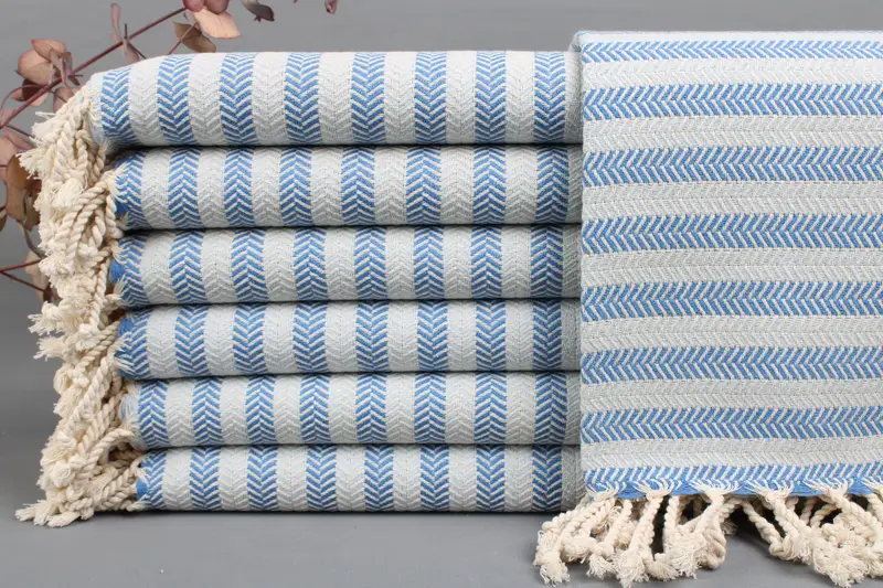 Turkish towels, characterized by their organic Turkish cotton composition, ensure superior absorbency and softness. Dimensions measure 40x70 inches or 100x180 centimeters, with a tolerance of ± 2 inches or 5 centimeters. Each piece weighs between 425 to 475 grams, handwoven on looms to provide intricate details.