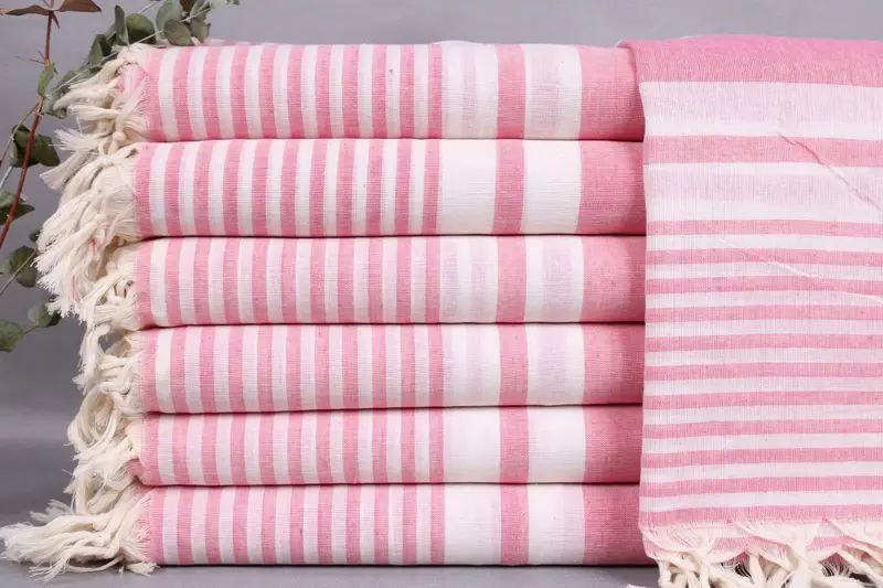 Each Turkish towel is meticulously woven from organic Turkish cotton on looms, ensuring durability and comfort. Resulting in a size of 40x71 inches or 100x180 centimeters with a ±2" or 5cm tolerance due to hand-weaving. Each towel weighs 200 grams, offering substantial absorbency.