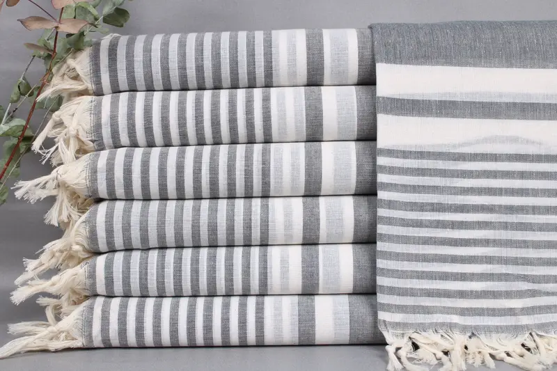 Turkish towels, characterized by their high-quality organic Turkish cotton, ensure optimal absorbency and durability. The towels, sized 40x71 inches or 100x180 centimeters with a tolerance of ± 2 inches or 5 centimeters, weigh 200 grams, making them suitable for various uses. Hand-woven on looms, these items provide a unique finish that enhances their aesthetic appeal.