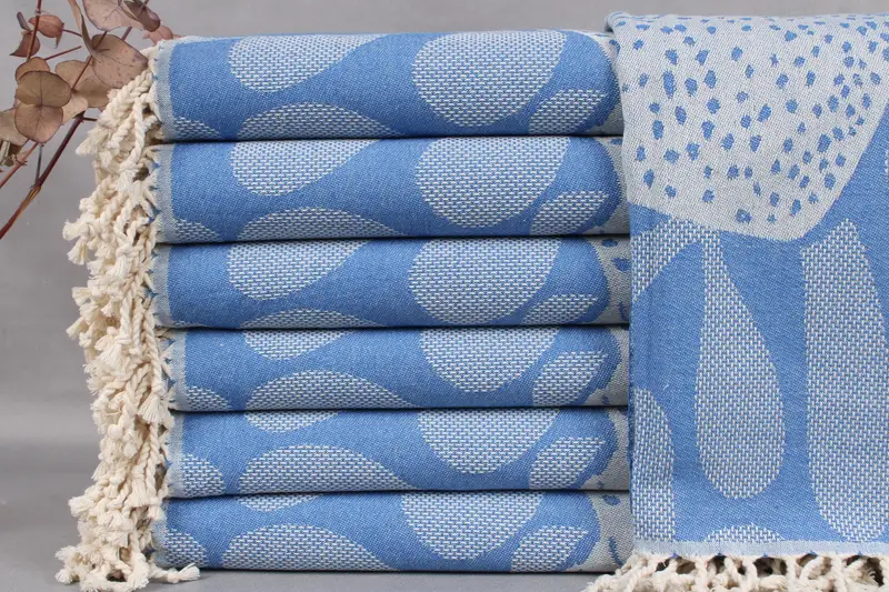 The beach towels are woven from organic Turkish cotton, ensuring durability and softness. Each towel measures 40x71 inches or 100x180 centimeters, with a weight of 450 grams. Hand-woven on looms, they exhibit a tolerance of ±2 inches or 5 cm in dimensions.