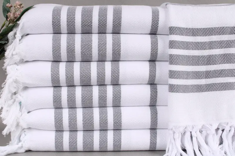 Organic Turkish cotton characterizes the tea towel, ensuring high absorbency and durability. Resulting in a weight of 120 grams per towel, each piece measures 24x36 inches (60x90 centimeters) with a tolerance of ±2 inches (±5 centimeters). Handwoven on looms, these towels come pre-shrunk.