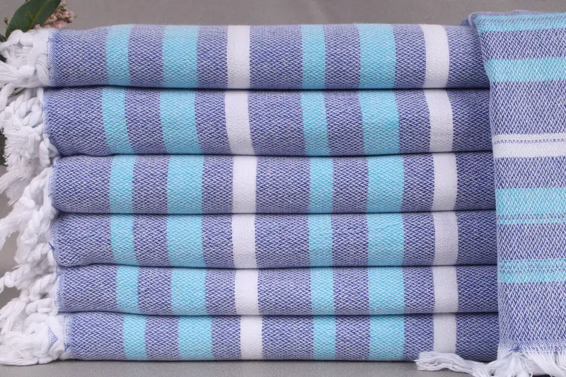 Turkish towels are characterized by their use of organic Turkish cotton, ensuring superior absorbency and durability. Resulting in a soft, lightweight texture, these towels are woven by hand on looms, measuring 40x71 inches or 100x180 centimeters with a weight of 280 grams. Each piece may exhibit a ± 2 inches or 5 centimeters tolerance due to the manual weaving process.