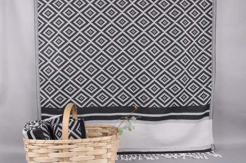 The Turkish towels are woven from organic Turkish cotton on looms, ensuring a high-quality, breathable, and absorbent product. Resulting in a towel weight of 420 grams, each piece measures 69x36 inches (175x90 centimeters) with a weaving tolerance of ±2" or ±5 centimeters. Customization options include embroidery or name placement, allowing personalization with letters, names, or logos.