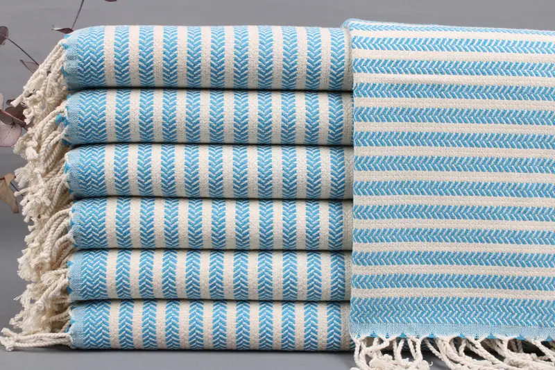 Turkish cotton weaves form the basis of these towels, ensuring high absorbency and durability. Characterized by dimensions of 18x40 inches or 45x100 centimeters, these towels weigh approximately 114 grams each. Hand-weaving tolerances allow for size variations of ± 2 inches or 5 centimeters.