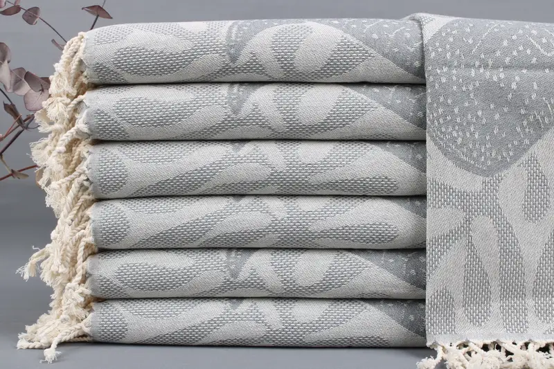 Organic Turkish cotton characterizes the product, providing a high-absorbency fiber composition. Resulting in a versatile and durable textile suitable for various uses. Dimensions are specified as 18x38 inches or 45x95 centimeters, with a tolerance of ±2 inches or 5 centimeters due to hand-weaving. Weighing 90 grams, the towels cater to different needs.