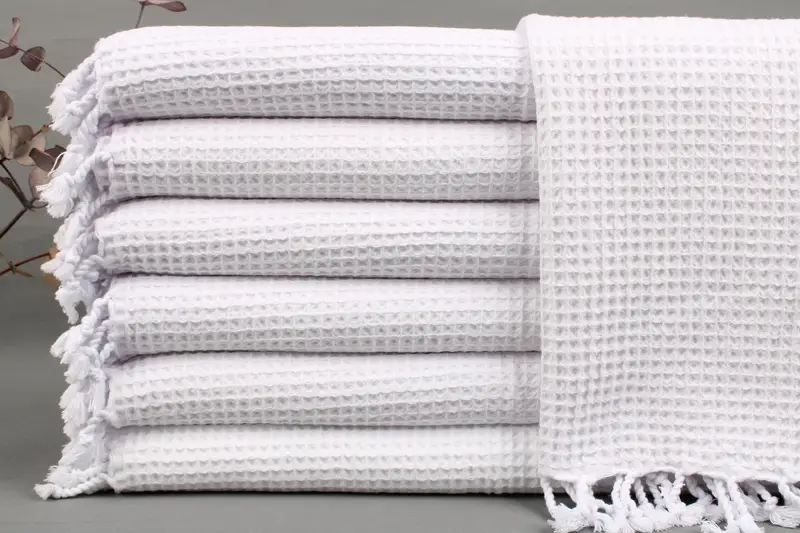 Turkish beach towels and hand towels are woven from organic Turkish cotton on looms, ensuring a high-quality, handmade product. Each towel measures 20x38 inches or 50x95 centimeters and weighs 156 grams, with size tolerances of ±2 inches or 5 centimeters. Resulting in a soft, luxurious fabric that becomes more pliable with each wash.