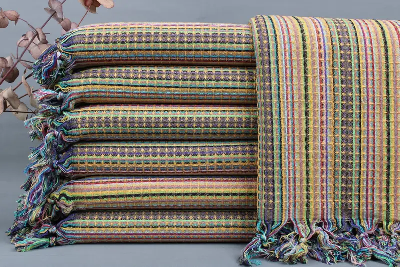 Turkish bath towels are woven from organic Turkish cotton on looms, ensuring a natural and eco-friendly product. Resulting in a soft, absorbent towel ideal for various uses, they are characterized by a hand-weaving process that can cause a tolerance of ±2 inches or 5 cm in size. Each towel weighs between 425-475 grams and measures 40x70 inches or 100x180 cm.