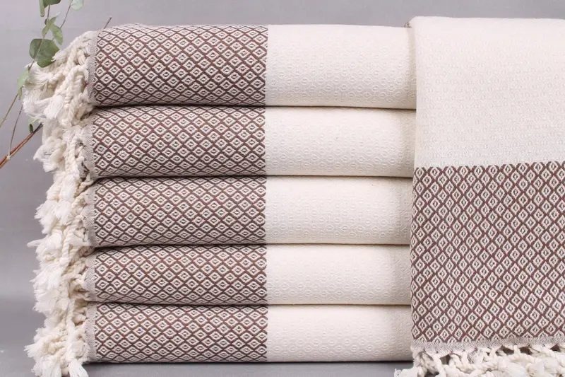 Each linen towel is woven from organic Turkish cotton ensuring durability and breathability. Characterized by a soft texture, these towels have an absorbency rate that enhances usability across various scenarios. Each towel measures 36x71 inches or 90x180 centimeters with a tolerance of ±2 inches or 5 centimeters due to hand weaving. Weighing 380 grams, they provide a substantial yet lightweight option for multiple uses.