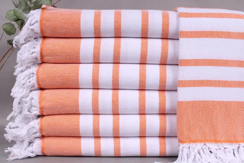 Turkish cotton beach towels, blankets, and throws are woven from organic Turkish cotton, ensuring high quality and superior absorbency. Characterized by their dimensions of 36x67 inches (90x170 centimeters) and a weight of 380 grams, these products exhibit a tolerance of ±2 inches (5 cm) due to the hand-weaving process. Personalization options include embroidery or name placement, with specific details required for customization.