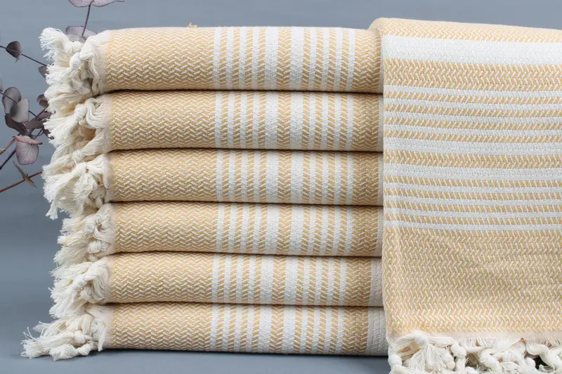 Constructed from organic Turkish cotton, the towels ensure superior absorbency and comfort. Resulting in a weight of 420 grams, the beach towels are hand-woven on looms, measuring 40x71 inches or 100x180 centimeters. The weaving tolerance is ±2 inches or 5 centimeters.