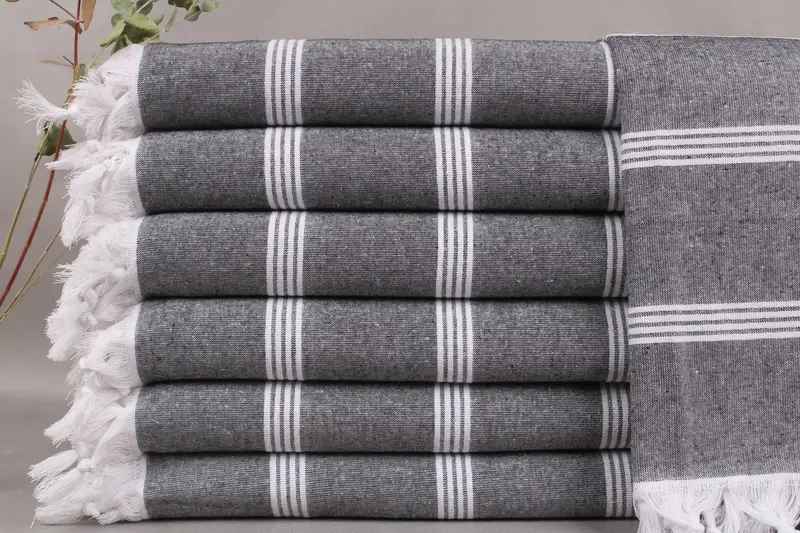 The towels are produced from organic Turkish cotton, ensuring durability and high quality. Characterized by a weight of 240 grams, they measure 30x69 inches or 75x175 centimeters, allowing for ± 2 inches or 5 centimeters variation due to hand weaving. Each towel is pre-shrunk, providing a stable size for user convenience.