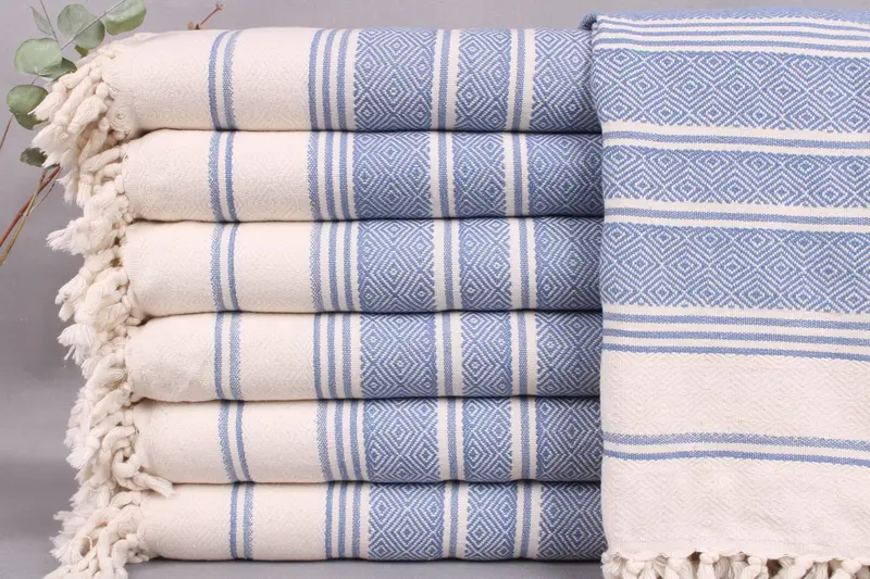 Turkish towels, hand towels, and blankets are woven from organic Turkish cotton, ensuring high-quality absorbency and durability. These items are meticulously hand-woven on looms, resulting in dimensions of 40x71 inches or 100x180 centimeters, with a weight of 370 grams. Each piece allows a tolerance of ±2 inches or 5 centimeters due to the traditional weaving process.