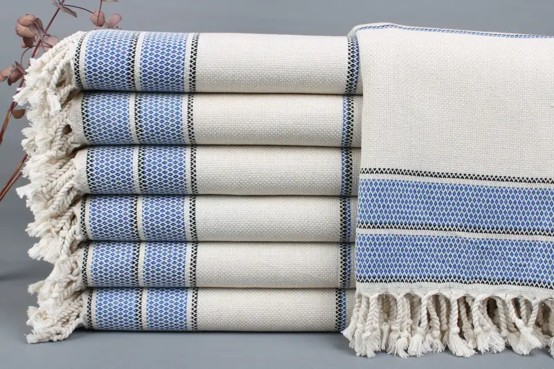 Turkish towels, featuring organic Turkish cotton, are characterized by their high absorbency and durability. Ensuring optimal softness and strength, these towels are woven from fibers sourced from Turkey. Resulting in a product that is both lightweight and resilient, the towels weigh between 425-475 grams. Each piece measures 40x70 inches or 100x180 centimeters, with a tolerance of ±2 inches or 5 centimeters due to the manual weaving process.