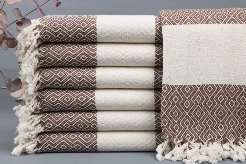 Organic Turkish cotton characterizes the textile, ensuring high absorbency and durability. Resulting in towels that are both lightweight and robust, weighing between 325-375 grams. The towels measure 38x67 inches or 95x170 centimeters, with hand-weaving tolerances of ±2 inches or 5 centimeters.