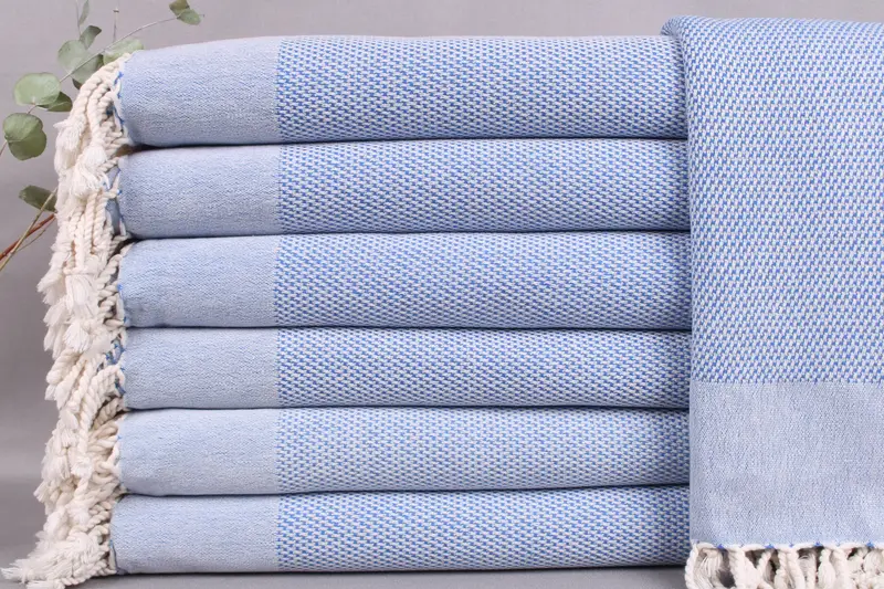 Woven from organic Turkish cotton, these beach towels exhibit high absorbency, ensuring efficient moisture management. Characterized by their 40x71 inches (100x180 cm) dimensions and 390 grams weight, each towel is handmade with a tolerance of ±2 inches or 5 cm. Resulting in a plush texture, pre-wash softening enhances their usability.