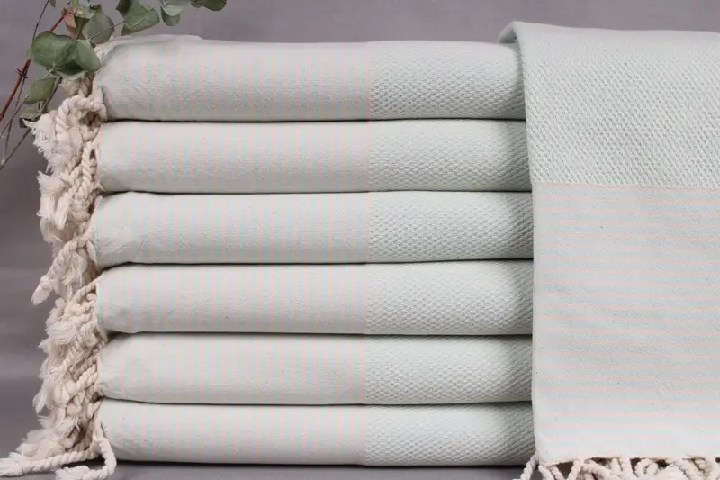 The towels are characterized by their organic Turkish cotton composition, ensuring superior absorbency and comfort. Each towel measures 36x71 inches or 90x180 centimeters, with a weight of 380 grams. Hand-weaving tolerances of ±2 inches or 5 centimeters result in slight variations in dimensions.