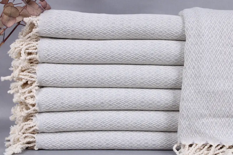 Woven from organic Turkish cotton, these towels, blankets, and throws ensure premium quality and hypoallergenic properties, characterized by high absorbency and durability. Each piece, typically 40x71 inches or 100x180 cm, weighs approximately 400 grams. The weaving process results in a tolerance of ±2 inches or 5 cm in dimensions.