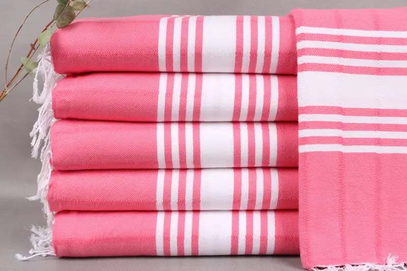 Organic Turkish cotton fiber composition characterizes these towels, ensuring high absorbency and softness. Each towel measures 40x71 inches or 100x180 centimeters, with a weight of 380 grams. Resulting in a hand-weaving tolerance of ±2 inches or 5 centimeters.