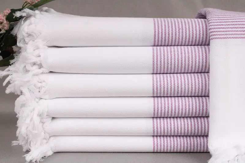 The product, characterized by its fiber composition, is woven from organic Turkish cotton, ensuring durability and softness. The towels measure 40x71 inches or 100x180 centimeters, with a weight of 290 grams. Resulting in slight variations of ± 2 inches or 5 centimeters due to the hand-weaving process. Personalization options include embroidery or monogramming with specified letters, names, logos, fonts, and colors, ideally placed at the bottom middle.