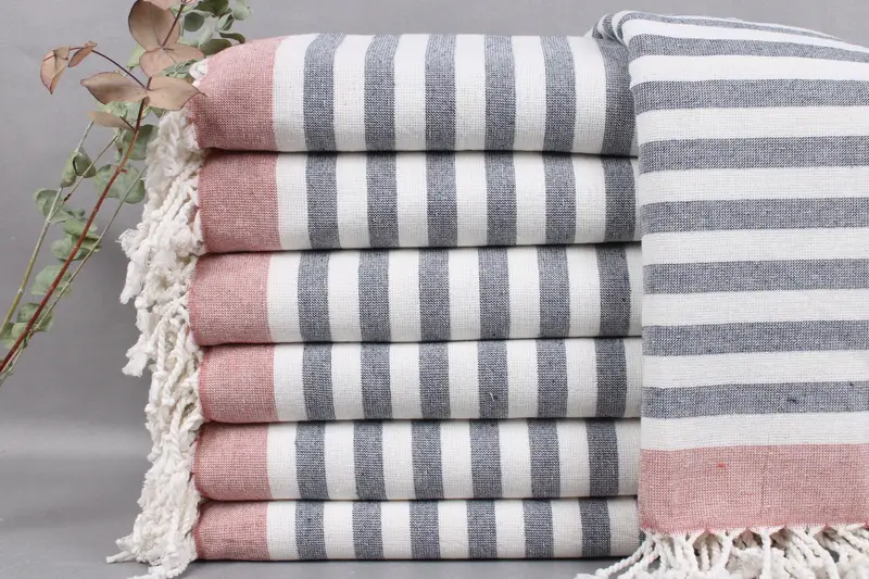 Organic Turkish cotton characterizes the towels, ensuring high absorbency and durability. Resulting in towels that become softer with each wash, they are woven by hand on looms with a tolerance of ± 2 inches or 5 centimeters. Weighing 422 grams, each product measures 40x67 inches or 100x170 centimeters.