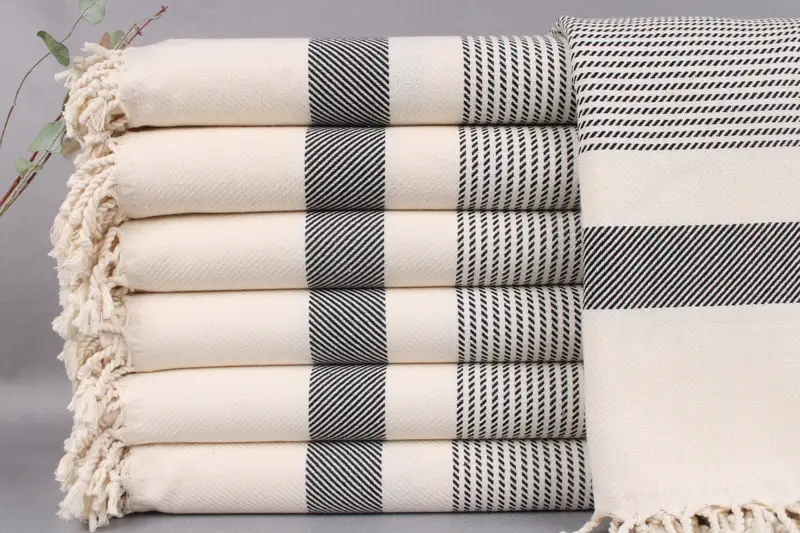 Crafted from organic Turkish cotton, these towels are woven by hand on looms, ensuring superior quality and durability. Characterized by an absorbency rate that improves with each wash, they are designed to become softer and more effective. Dimensions are precise at 40x71 inches or 100x180 centimeters, with a permissible tolerance of ± 2 inches or 5 centimeters due to the hand-weaving process. Each towel weighs 400 grams.